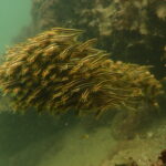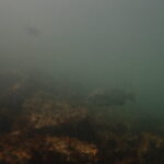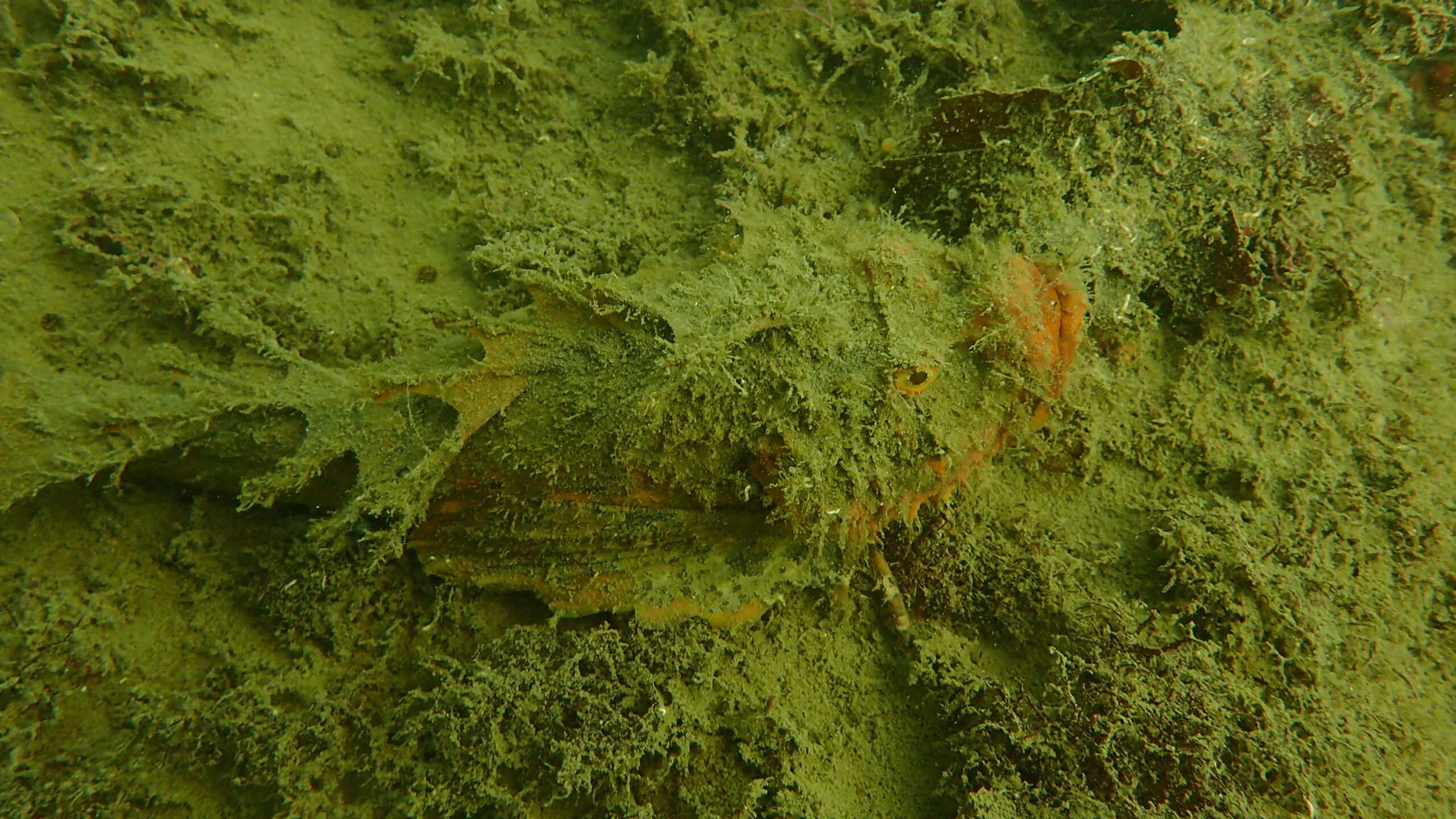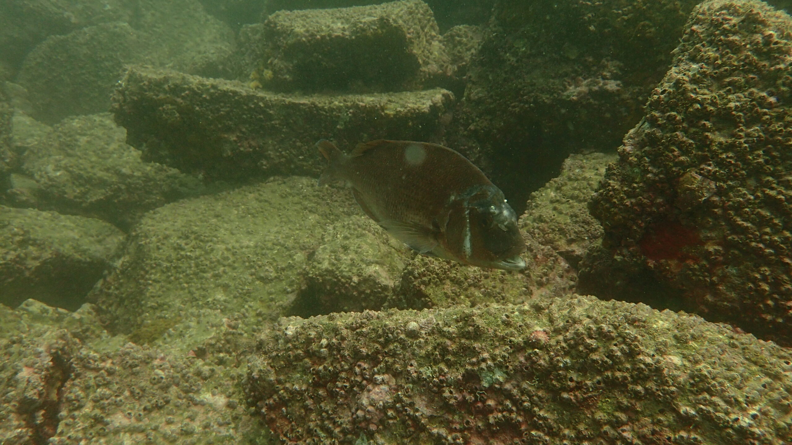 オコゼの隠れは上手だね、クロダイもダイバーを気にせず、岩をガリガリくん