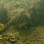 特徴のある、グレが1匹いました。横縞で白い線1本あります、よく目立ちます